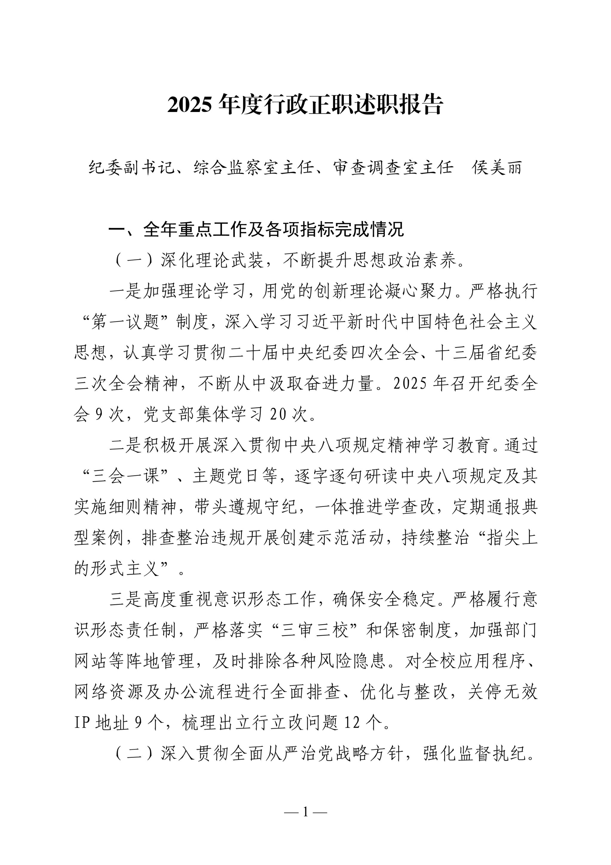 学校纪委副书记侯美丽2025年述职述廉报告